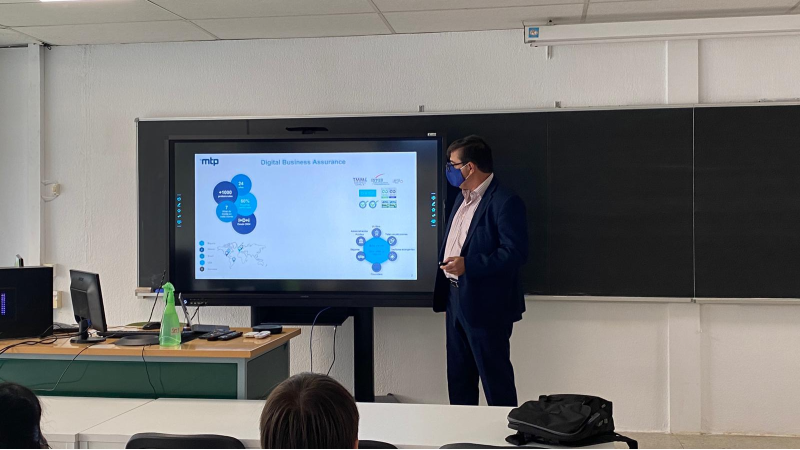 Luis Redondo, responsable de Innovación de MTP, presentó ayer la empresa a los alumnos asistentes, explicando en qué consiste nuestra actividad en ámbitos como la Calidad de Software (QA), DevOps, Experiencia de Usuario (UX) y Ciberseguridad. También dedicó especial atención al departamento que dirige, Innovación, así como a los proyectos y herramientas con los que trabaja, y casos de éxito y aplicaciones de las investigaciones a soluciones concretas para clientes.