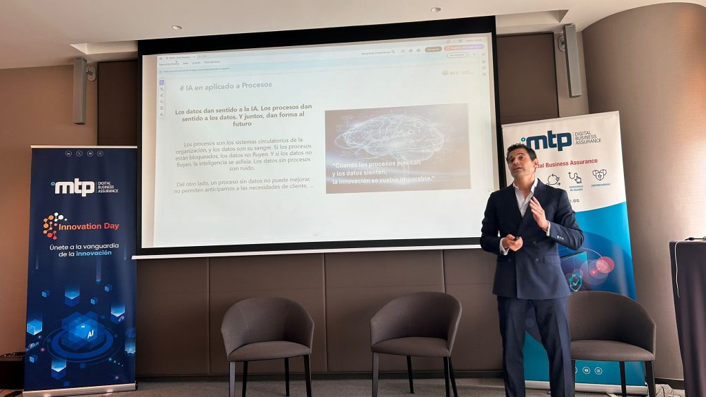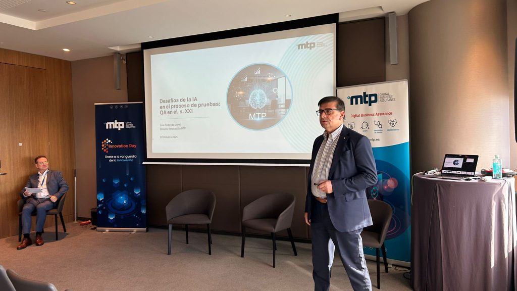 Luis Redondo, responsable de Innovación en MTP, ha sido el siguiente ponente, centrando su exposición en el ámbito del aseguramiento de la calidad del software (QA), área en la que MTP es empresa especializada. Además de presentar los diferentes proyectos de I+D en los que trabaja el área de Innovación de MTP, muchos de los cuales tienen a la IA como protagonista, Luis Redondo ha detallado cómo nuestra empresa tiene incorporada la IA para conseguir mayor eficiencia, calidad y ahorro de costes en diferentes procesos de pruebas y otros trabajos para asegurar la calidad del software.
